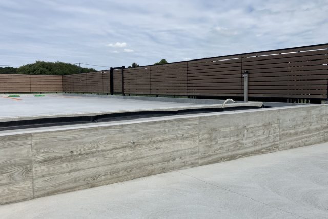 RC杉板模様の擁壁に ウッド調アルミフェンス 土間工事が完成しました。