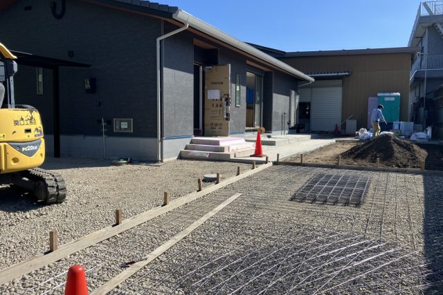 新築外構工事中です。 リビングから外へフラットにつながるタイルデッキ施工予定です。 家と外との繋がり