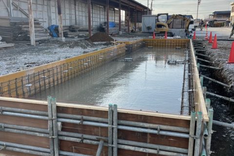 筑西市、工場敷地内にて台貫基礎工事のベース打設が完了しました。