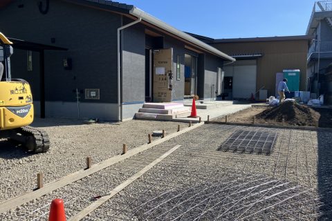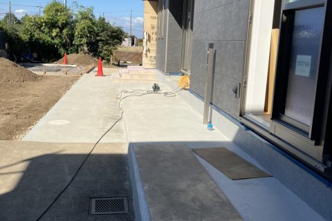 新築外構工事 2025/10/14 新築外構工事中です。 リビングから外へフラットにつながるタイルデッキ施工予定です。 家と外との繋がりがあることで生活空間がより豊かになります。 リビングからは芝生で遊ぶ子供等を見守りプール🎵 バーベキューなどへの配膳や ランドリースペースから洗濯干しスペースとしてお庭に出入りしやすくなります。